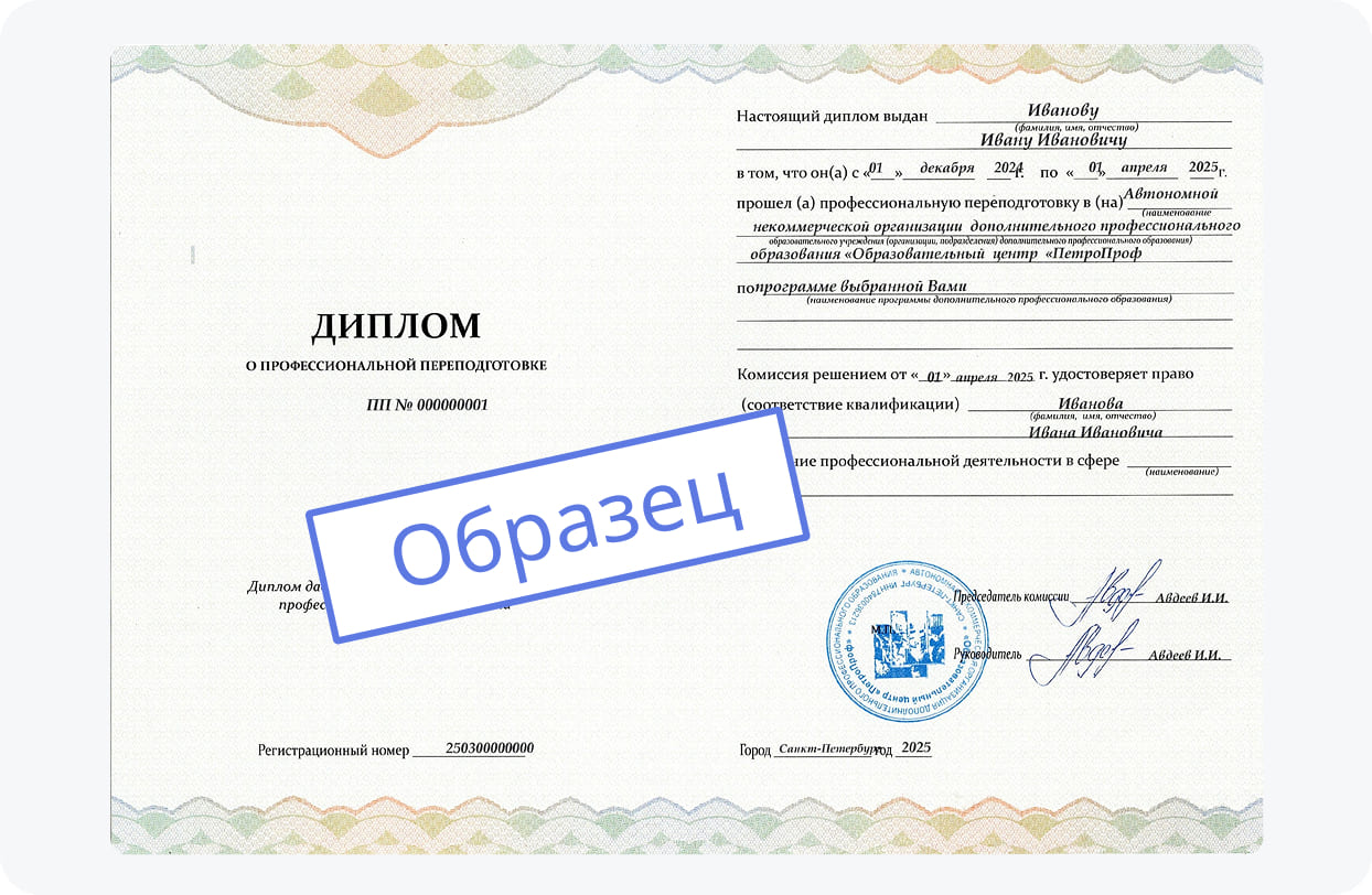 - По итогам обучения вы получаете диплом о профессиональной переподготовке, зарегистрированный в ФИС ФРДО;